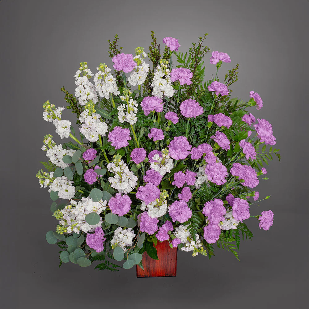 Carnations and greenery in a handsome holder present a meaningful tribute to someone truly beloved. It is perfect for any occasion where you wish to express how much someone means to you.